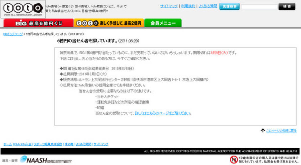 Totobig 6億円当せん者 まだ現れず 初の 期限切れ 近づく 11年8月6日 エキサイトニュース